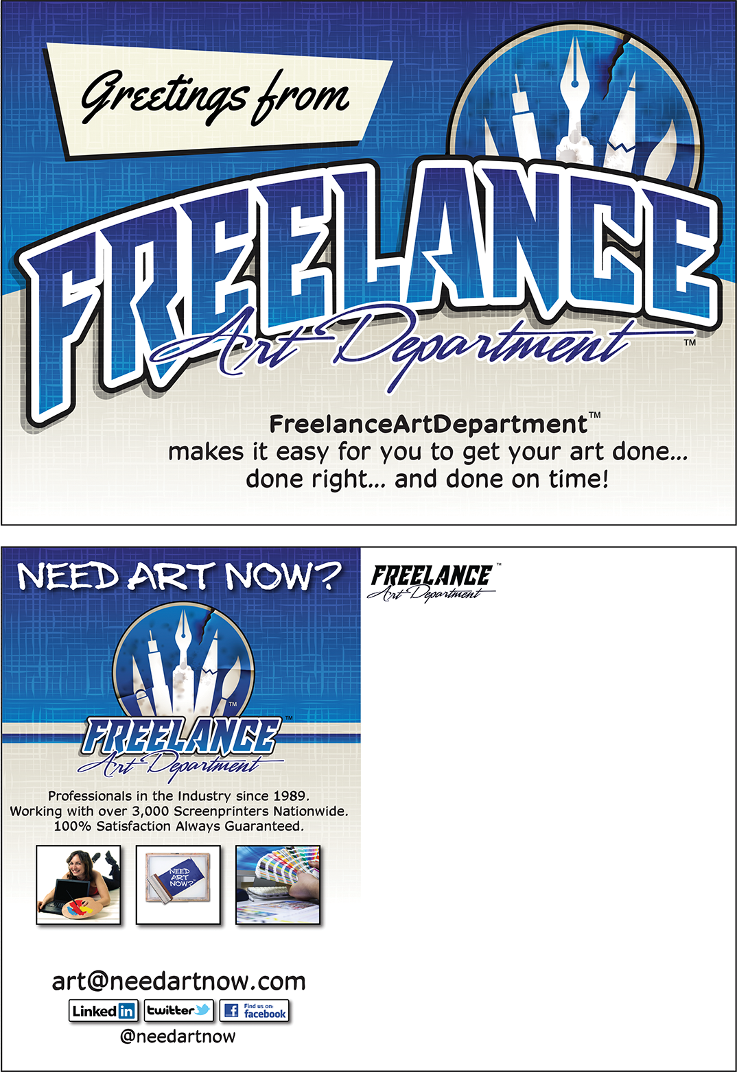 “No project (or printer) is too big or small, when you NeedArtNow, you can count on FreelanceArtDepartment™ to bring your vision to life!”